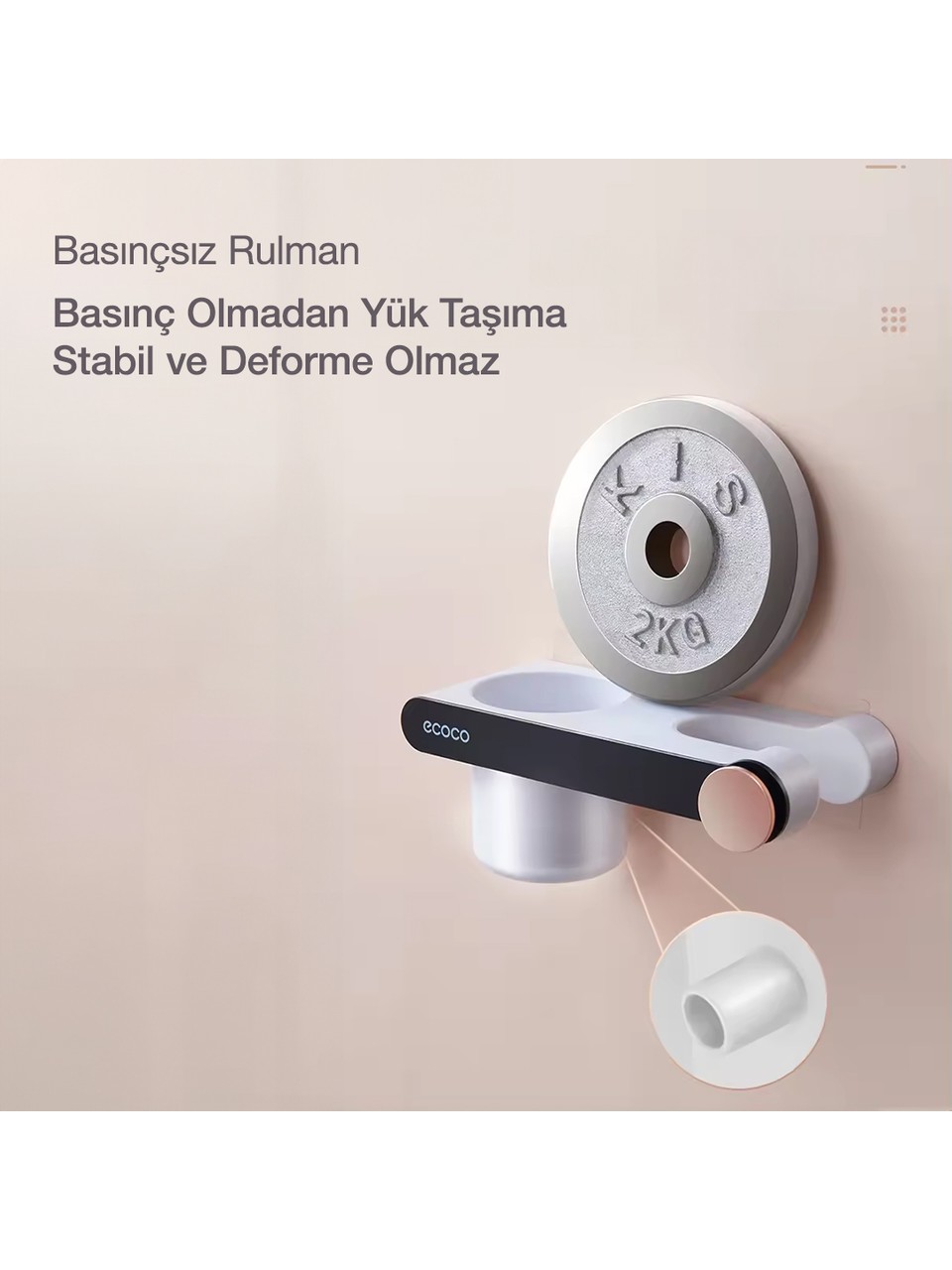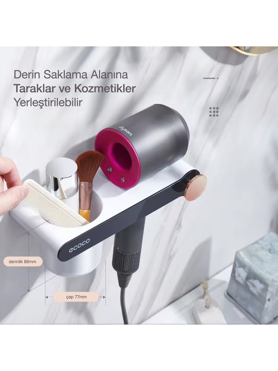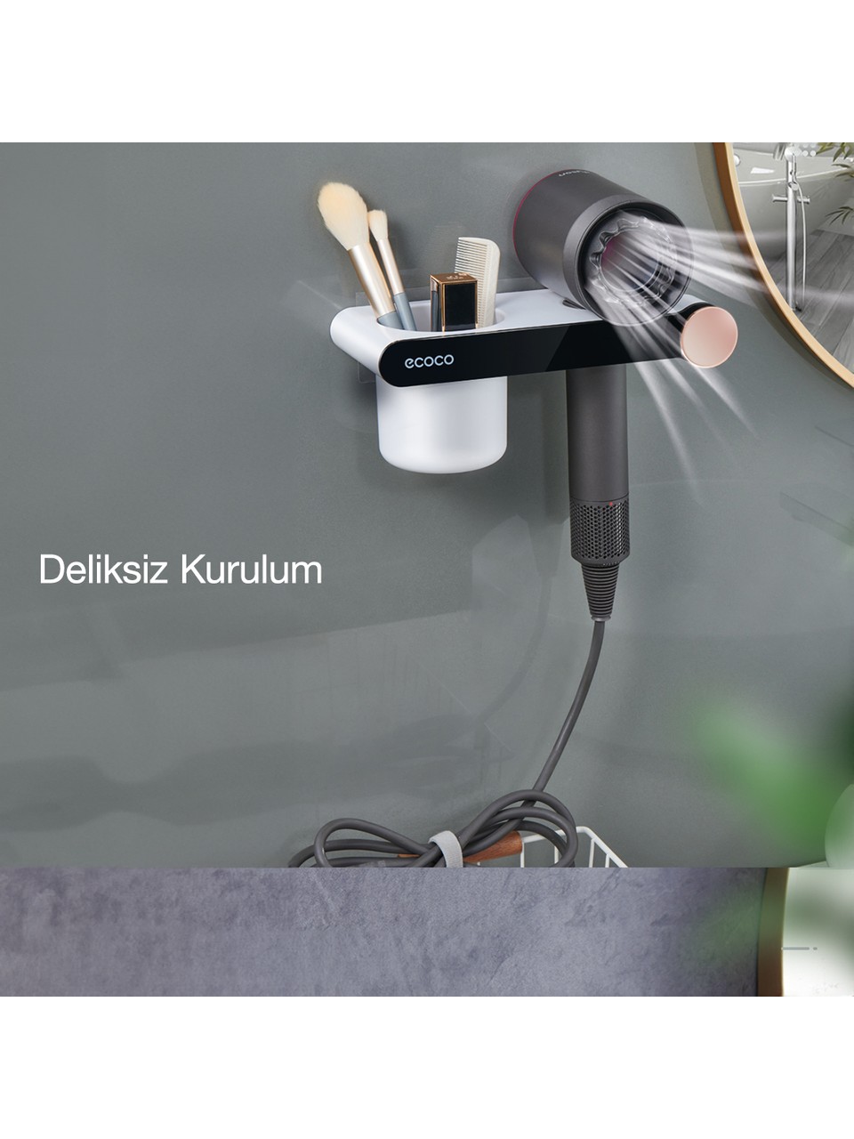 Ecoco Duvara Yapışkanlı Saç Kurutma Makinesi Tutacağı ve Düzenleyici, banyonuzda şıklık ve düzeni bir arada sunar. Güçlü yapışkanlı montaj sistemi sayesinde matkap ya da vida kullanmadan kolayca sabitlenir, duvarınıza zarar vermez. Gri ve beyaz renk uyumu, modern banyolara estetik bir dokunuş kazandırırken, dayanıklı malzemesi uzun süreli kullanım sağlar.